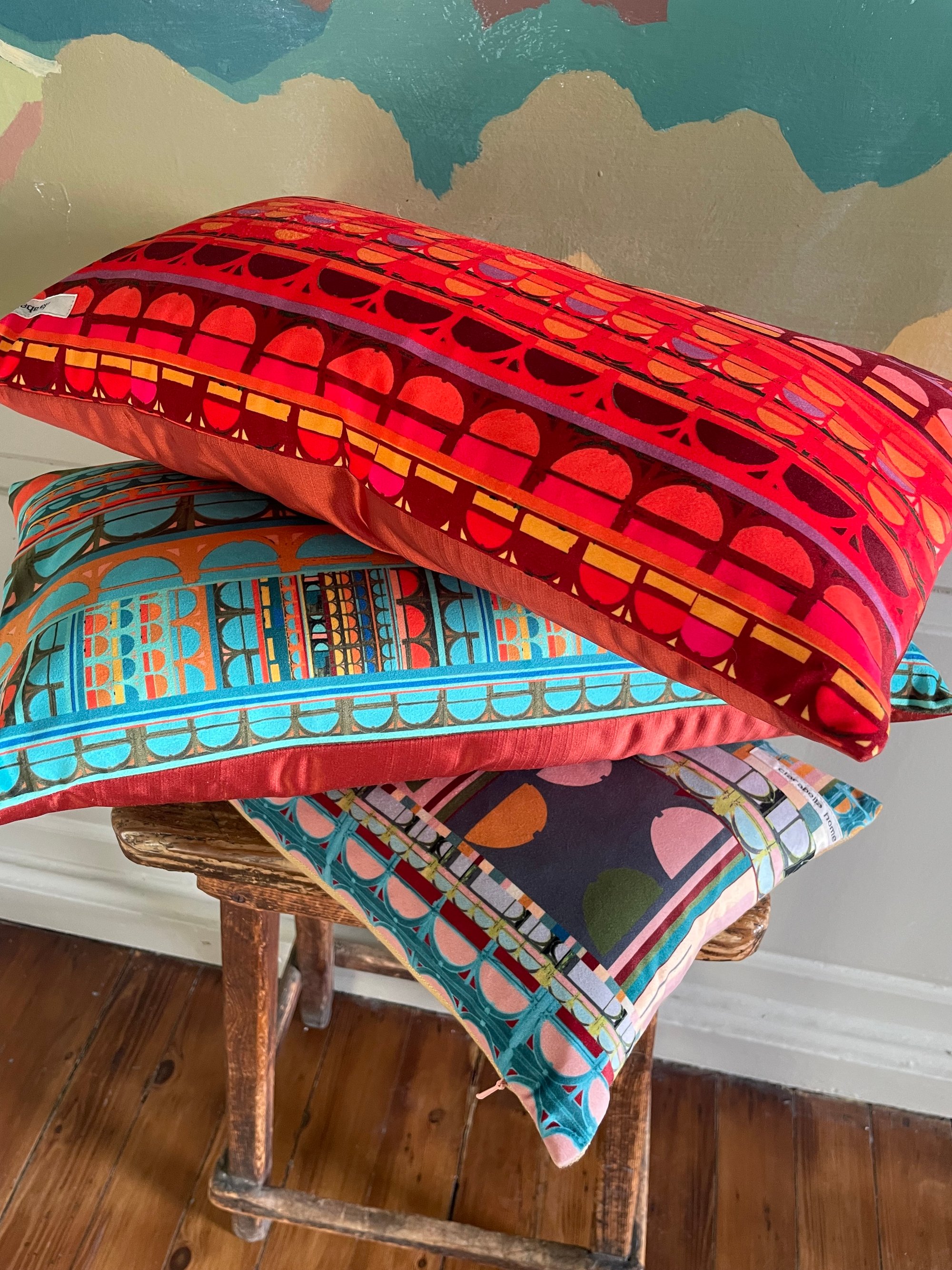 Curve is a print inspired by the architecture of Dunfermline, my studio home. This is a print from my archive reimagined as lush velvet bolster.
