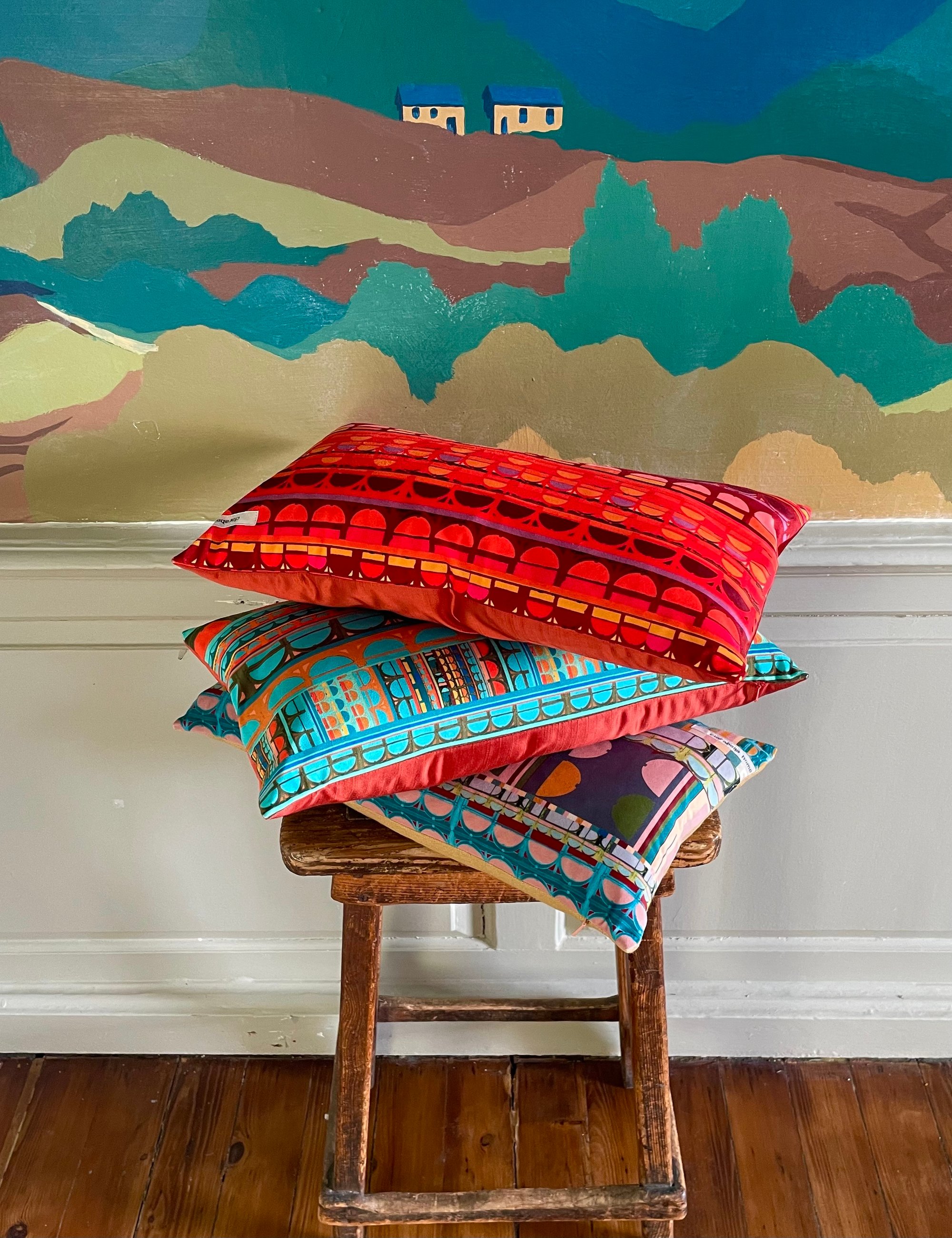 Curve is a print inspired by the architecture of Dunfermline, my studio home. This is a print from my archive reimagined as lush velvet bolster.